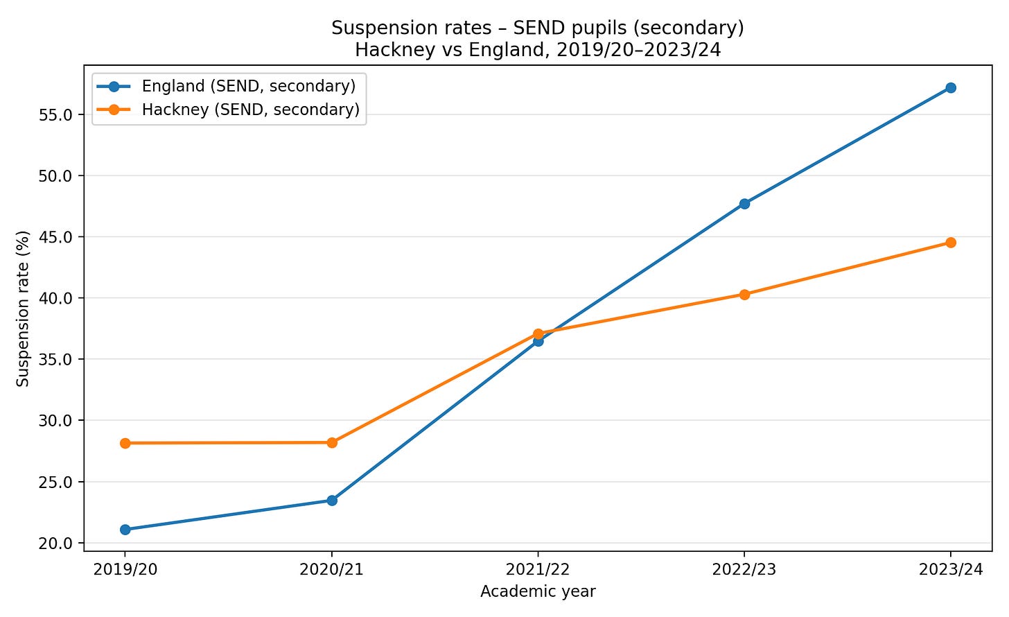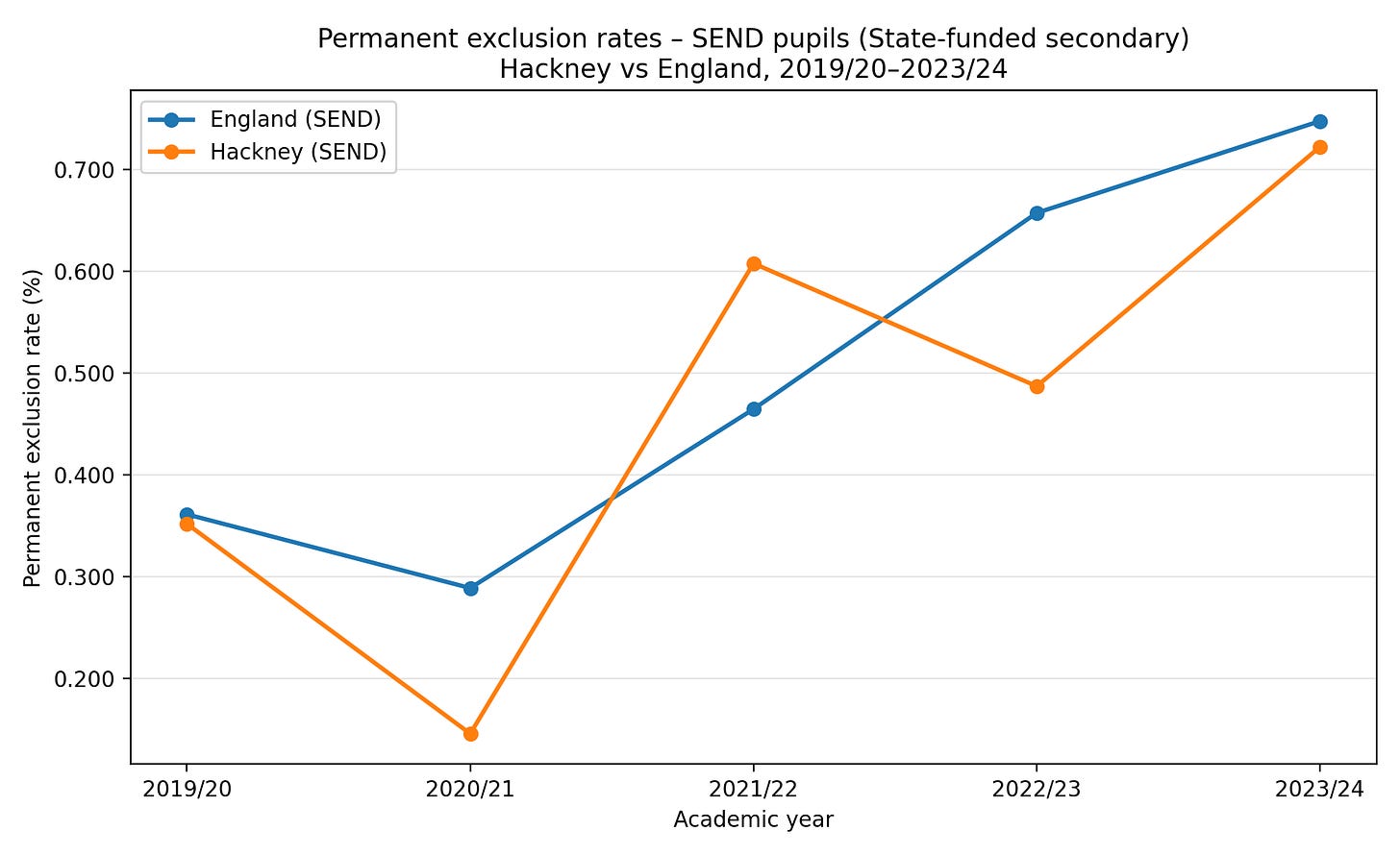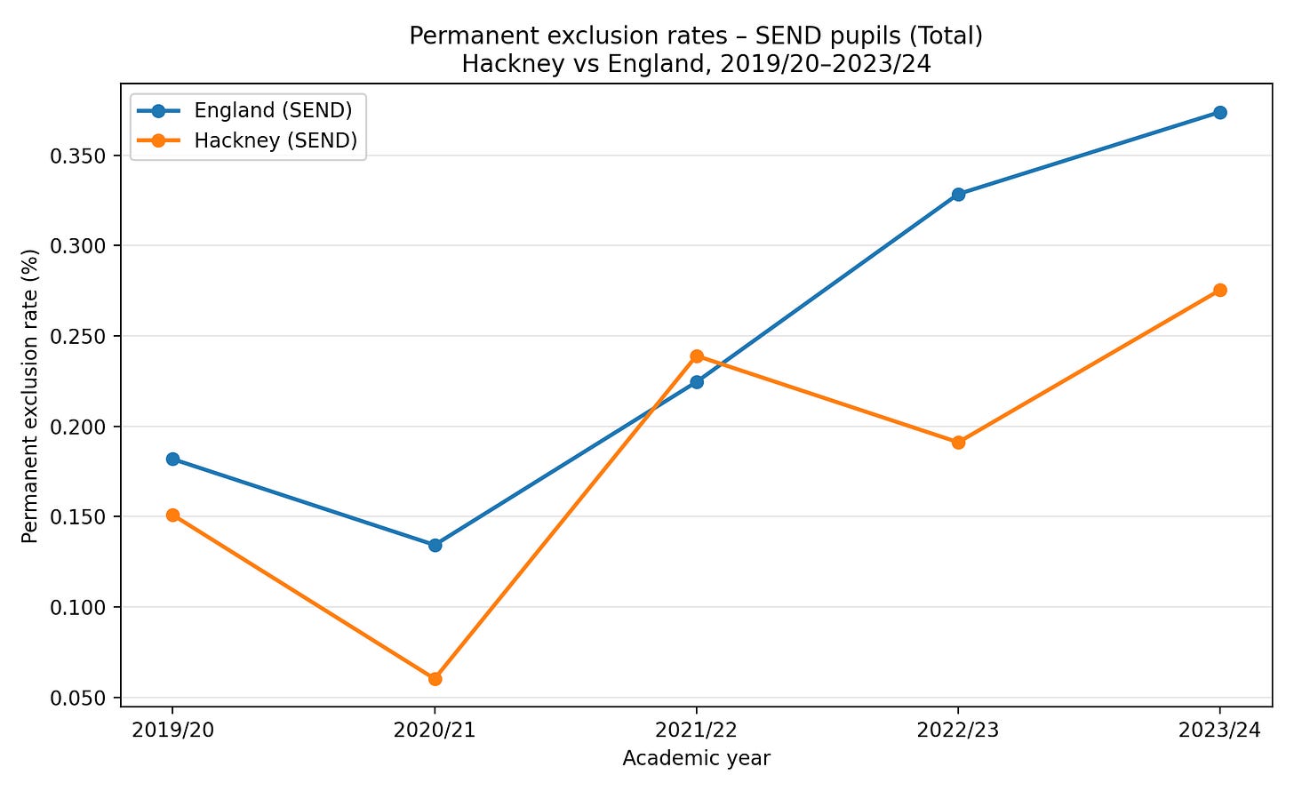 This4 does show three consecutive years of higher-than-average secondary school exclusions. So does the report have a point? I would say that this is the closest the report gets to making a valid observation about exclusions. However, this secondary-only figure gives a partial and potentially misleading picture. Why are primary schools not included in the figures? After all, excluded primary school pupils are much more likely to have SEND than excluded secondary school pupils. Looking at Hackney's exclusion data as a whole would have somewhat undercut the narrative. Although high in 2023/24, Hackney’s permanent exclusion rate has not been much different from the national average over the last few years.
