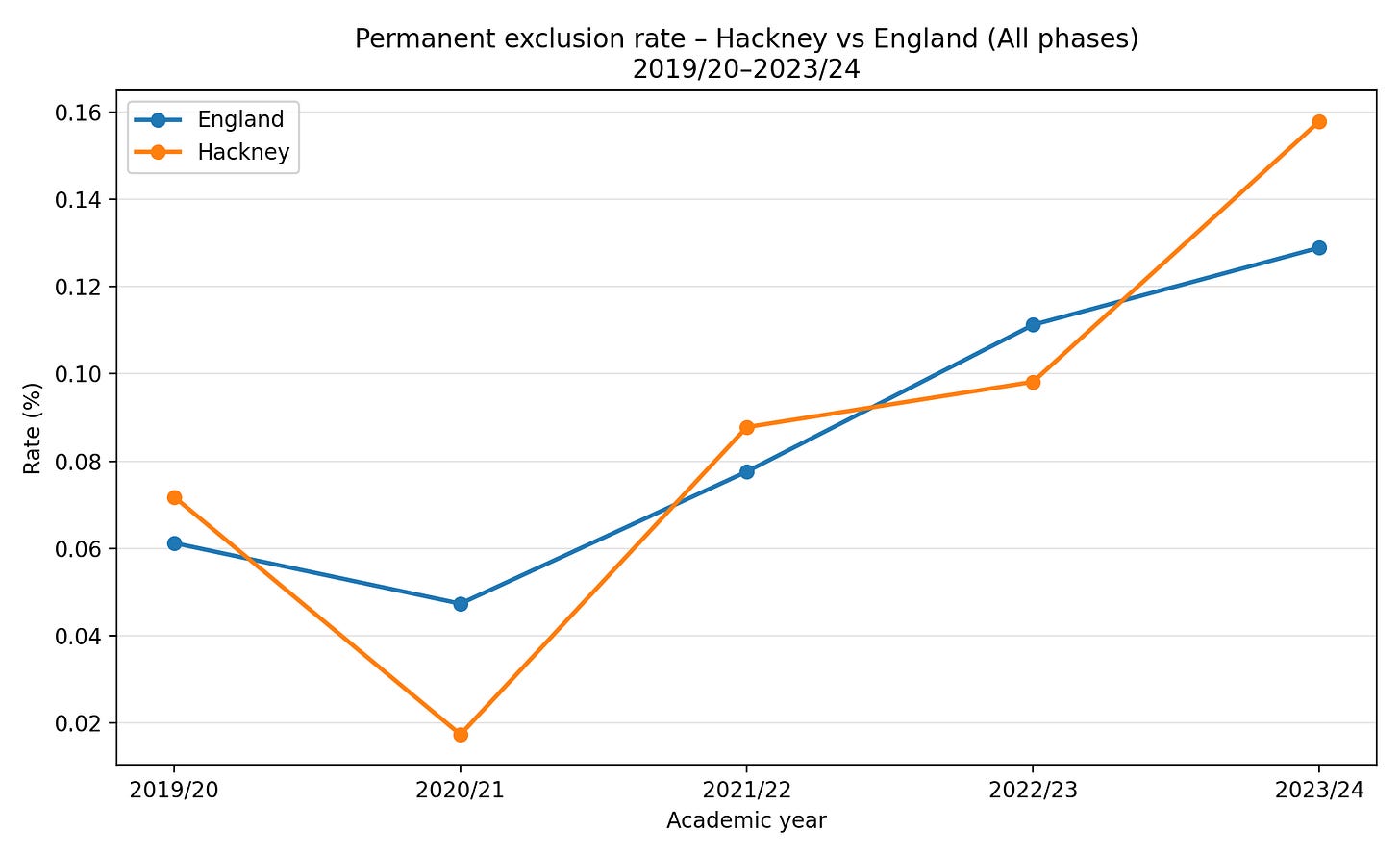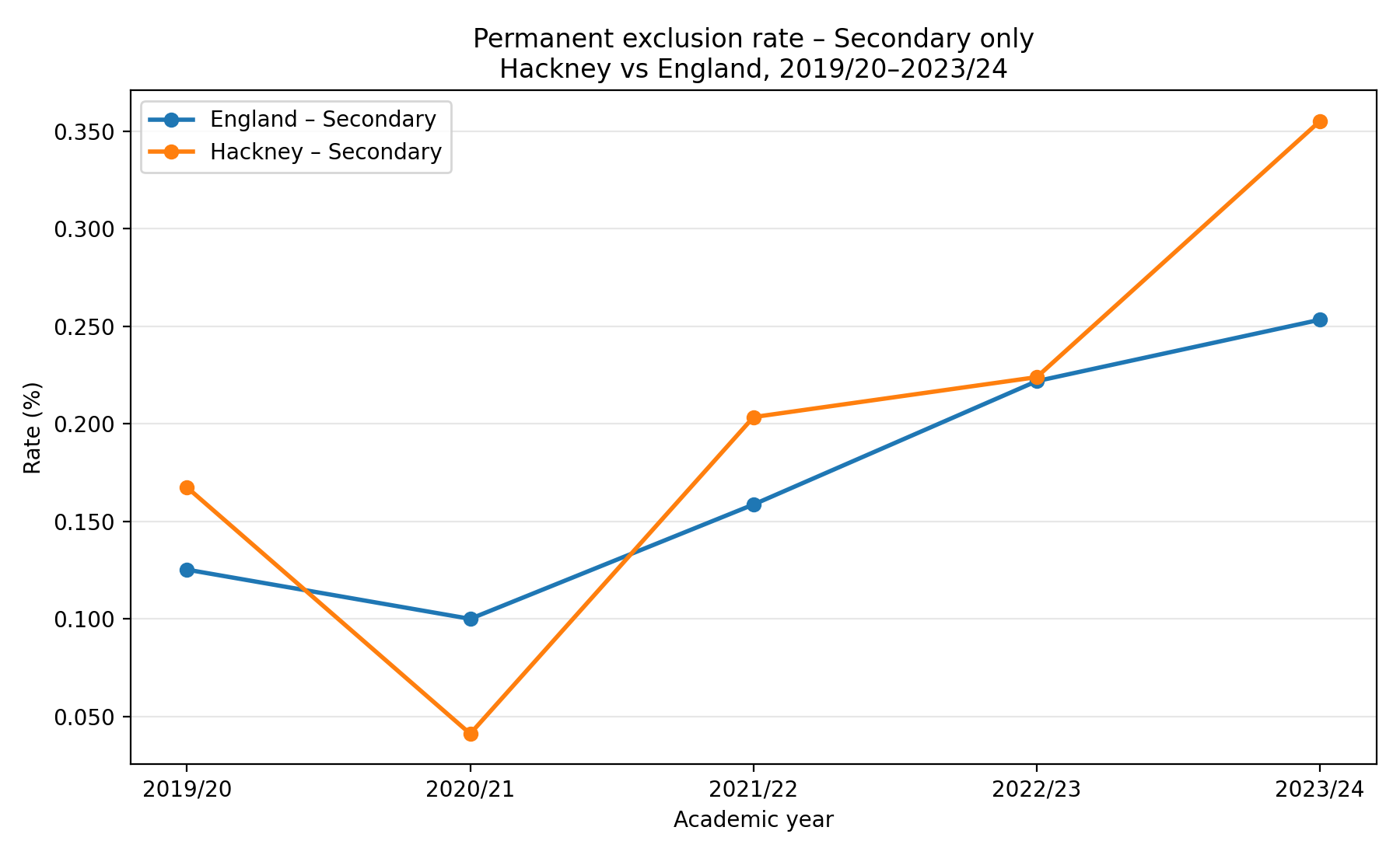Permanent exclusions in secondary schools in Hackney are high3 in the most recent annual figures. Data from the 2023/24 academic year show that the rate of permanent exclusions from Hackney secondary schools is higher than the national average, at 0.36% (i.e. 36 permanent exclusions per 10,000 pupils) compared with 0.25% for England as a whole. However, this rate varies from year to year, and those figures come from a year where Hackney happened to have the highest exclusion rate for some time.