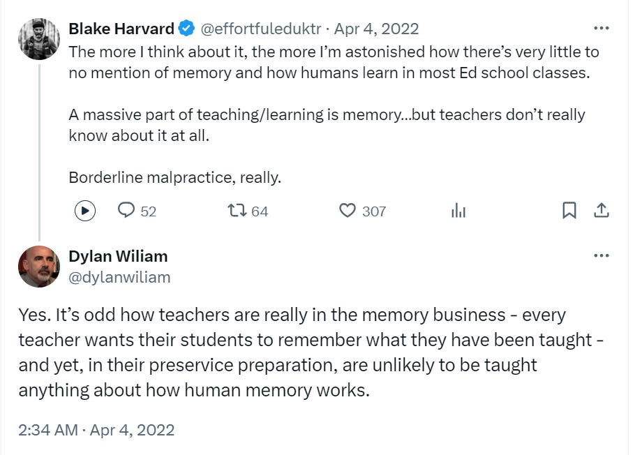 What I have to say in the rest of this post was originally prompted by the responses to a Twitter exchange between Blake Harvard and Dylan Wiliam. They discussed how memory is important for learning.