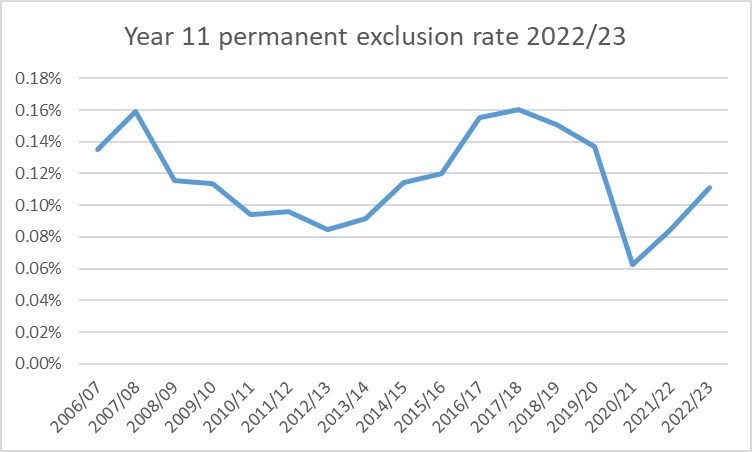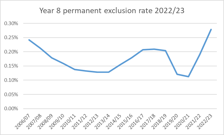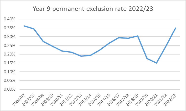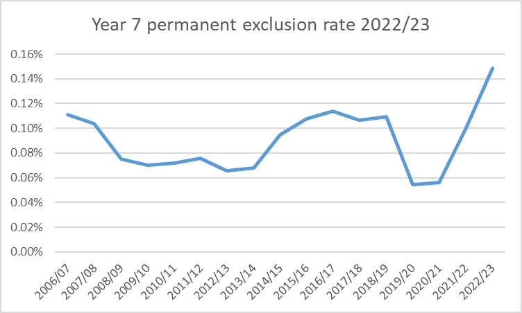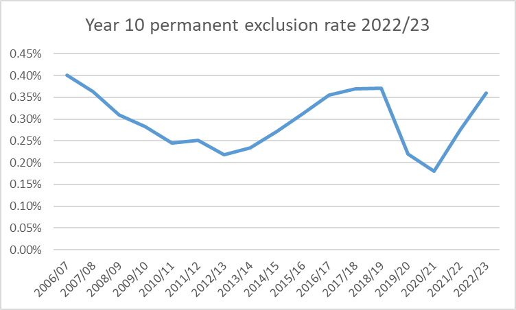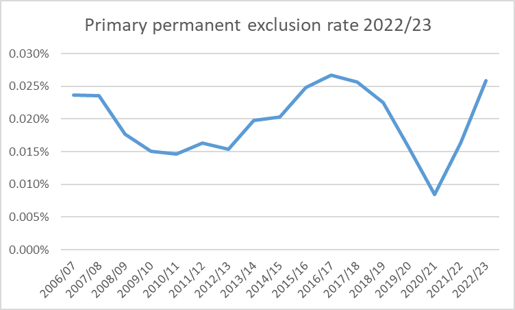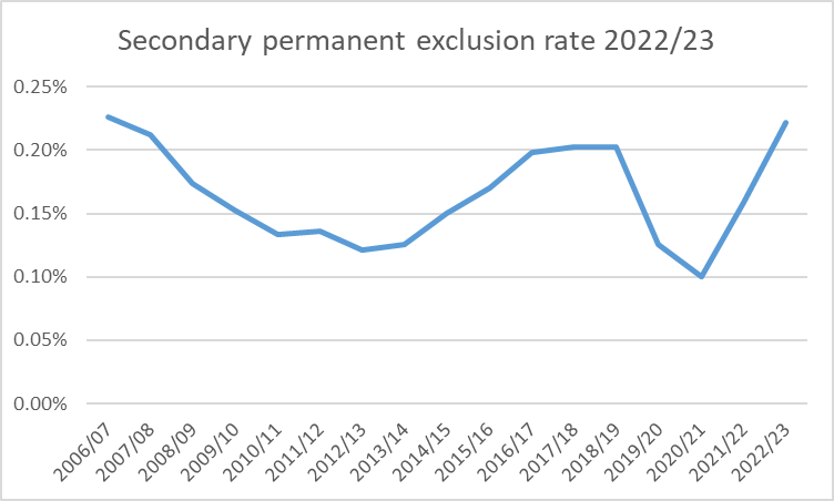 In my last post, I observed that permanent exclusions in the academic year 2022/23 had risen to a level much higher than before the pandemic.